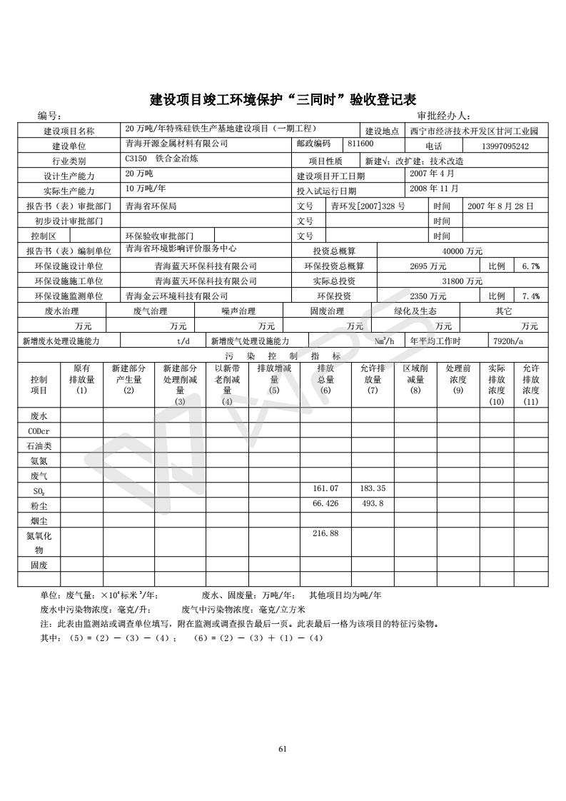 青海開源金屬材料有限公司20萬噸特殊硅鐵生產(chǎn)基地建設(shè)項目(一期工程)竣工環(huán)境保護(hù)驗收報告書會后修改20180521
