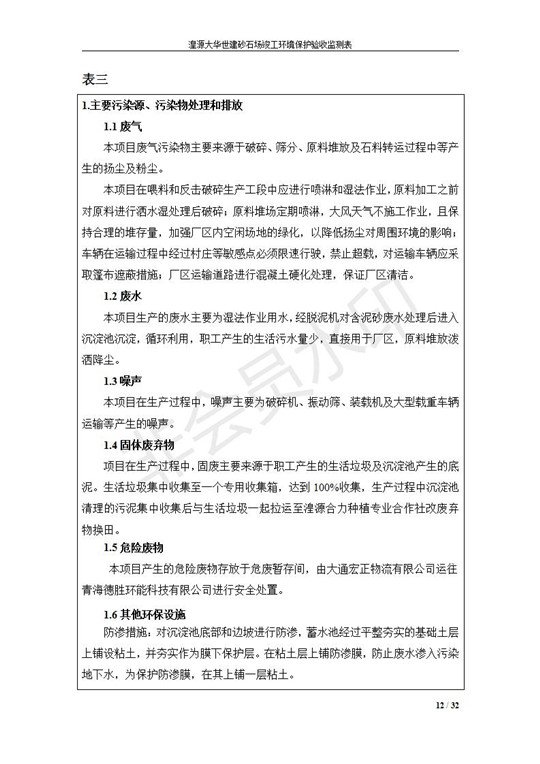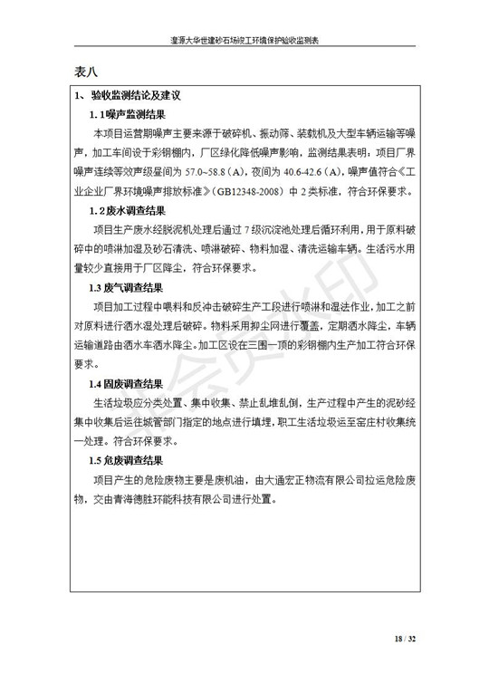 根據(jù)中華人民共和國國務(wù)院令第253號《建設(shè)項目環(huán)境保護管理條例》(中華人民共和國國務(wù)院令第682號《國務(wù)院關(guān)于修改〈建設(shè)項目環(huán)境保護管理條例〉的決定》和《建設(shè)項目竣工環(huán)境保護驗收暫行辦法》,嚴格依照有關(guān)法律法規(guī),建設(shè)項目環(huán)境保護設(shè)施驗收技術(shù)規(guī)范,本項目環(huán)評報告表和環(huán)保審批部門審批意見以及企業(yè)自行驗收相關(guān)要求等對本項目進行驗收,本項目符合環(huán)保驗收條件,可以通過環(huán)保驗收。 湟源大華世建砂石場建設(shè)項目竣工環(huán)境保護驗收意見.