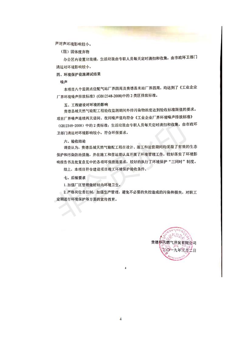 根據(jù)中華人民共和國(guó)務(wù)院令第682號(hào)《國(guó)務(wù)院關(guān)于修改〈建設(shè)項(xiàng)目環(huán)境保護(hù)管理?xiàng)l例〉的決定》和《建設(shè)項(xiàng)目竣工環(huán)境保護(hù)驗(yàn)收暫行辦法》(國(guó)務(wù)院令682號(hào)),貴德縣城輸配管線工程竣工環(huán)境保護(hù)驗(yàn)收內(nèi)容(包括竣工環(huán)境保護(hù)驗(yàn)收調(diào)查表和驗(yàn)收意見(jiàn))公示如下。 一、項(xiàng)目名稱:貴德縣城天然氣輸配工程 二、地點(diǎn):拉雞蓋澀寧蘭復(fù)線22#閥室-貴德縣城 三、建設(shè)單位:貴德華天燃?xì)忾_(kāi)發(fā)有限公司 四、建設(shè)內(nèi)容:貴德縣末站、貴德縣配氣站、貴德縣中壓管網(wǎng)、拉雞蓋22#閥室-貴德縣城長(zhǎng)輸管線 五、公示時(shí)間:二〇一九年三月十一日至二〇一九年四月八日 六、聯(lián)系人:張工 公示期間,對(duì)上述公示內(nèi)容如有異議,請(qǐng)以書(shū)面形式反饋,個(gè)人須署真實(shí)姓名,單位須加蓋公章。