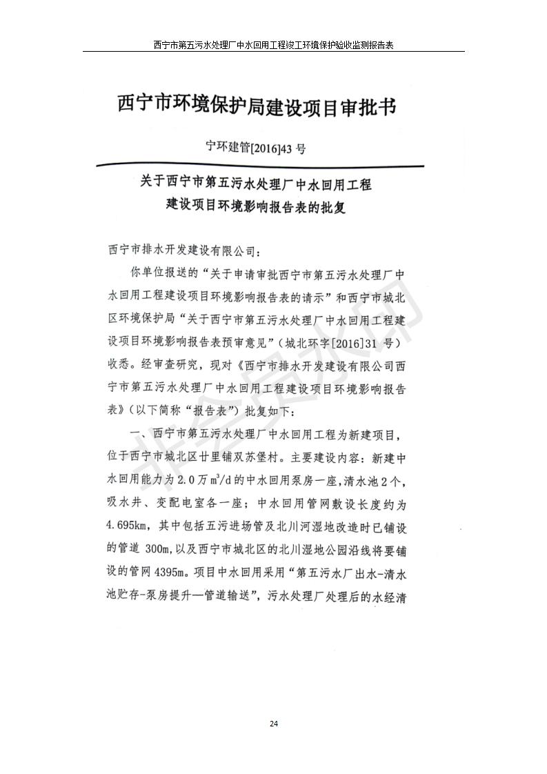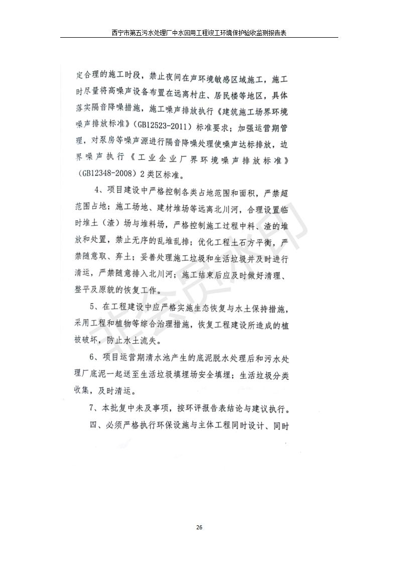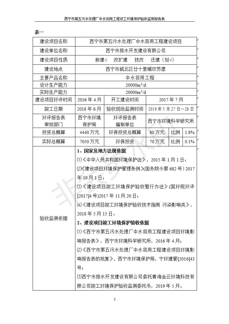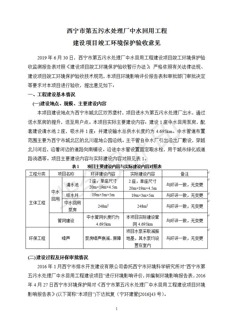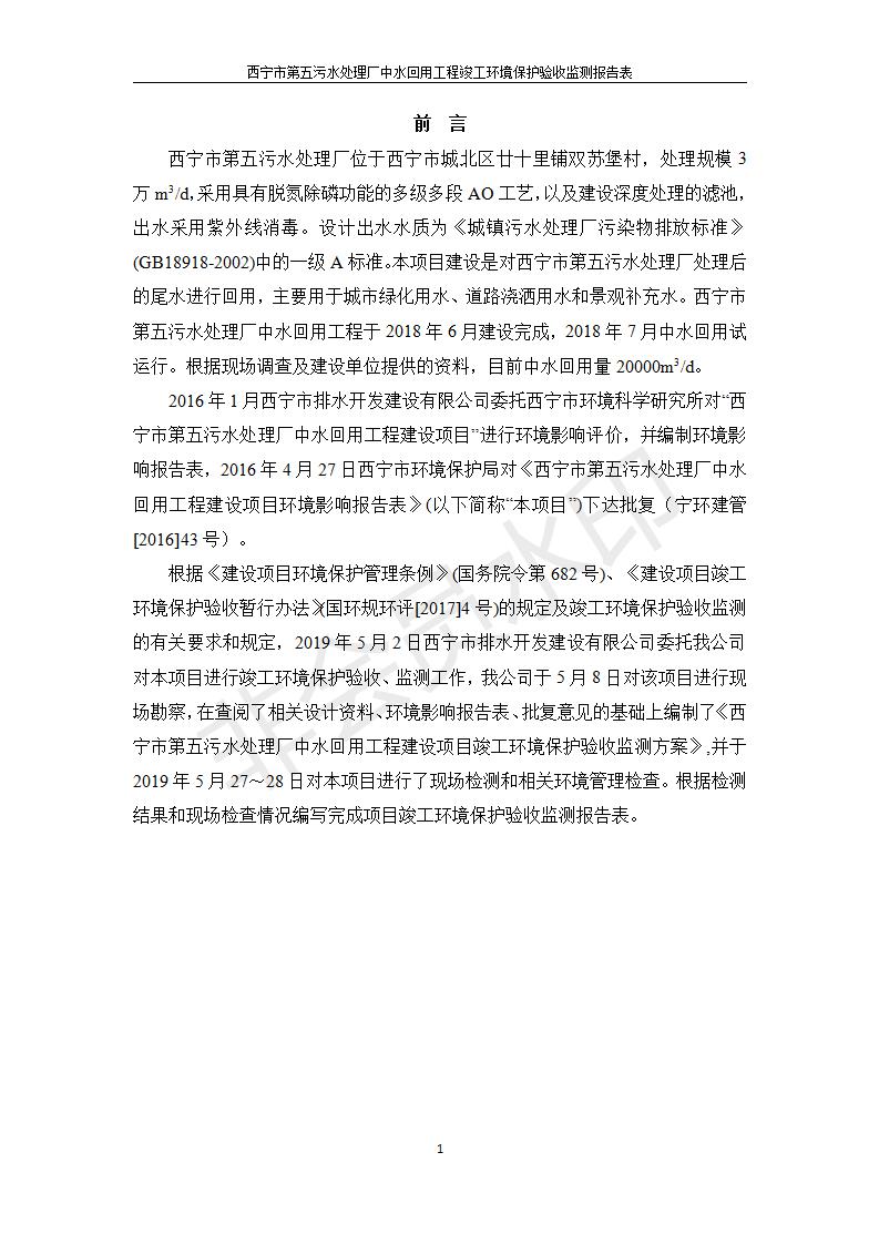 根據(jù)中華人民共和國國務院令第682號《國務院關(guān)于修改〈建設(shè)項目環(huán)境保護管理條例〉的決定》和《建設(shè)項目竣工環(huán)境保護驗收暫行辦法》(國務院令682號),西寧市第五污水處理廠中水回用工程建設(shè)項目(包括竣工環(huán)境保護驗收監(jiān)測報告表和驗收意見)公示如下。 一、項目名稱:西寧市第五污水處理廠中水回用工程建設(shè)項目 二、地點:西寧市城北區(qū)廿十里鋪雙蘇堡 三、建設(shè)單位:西寧市排水開發(fā)建設(shè)有限公司