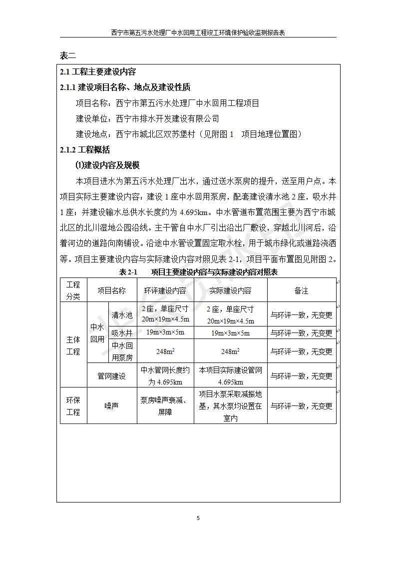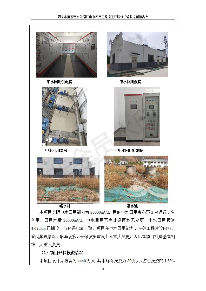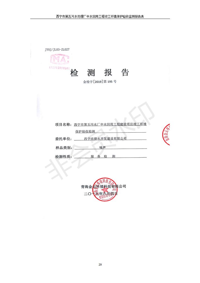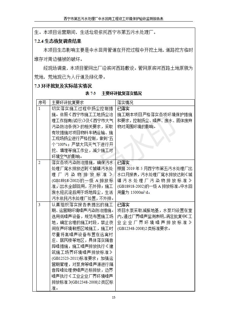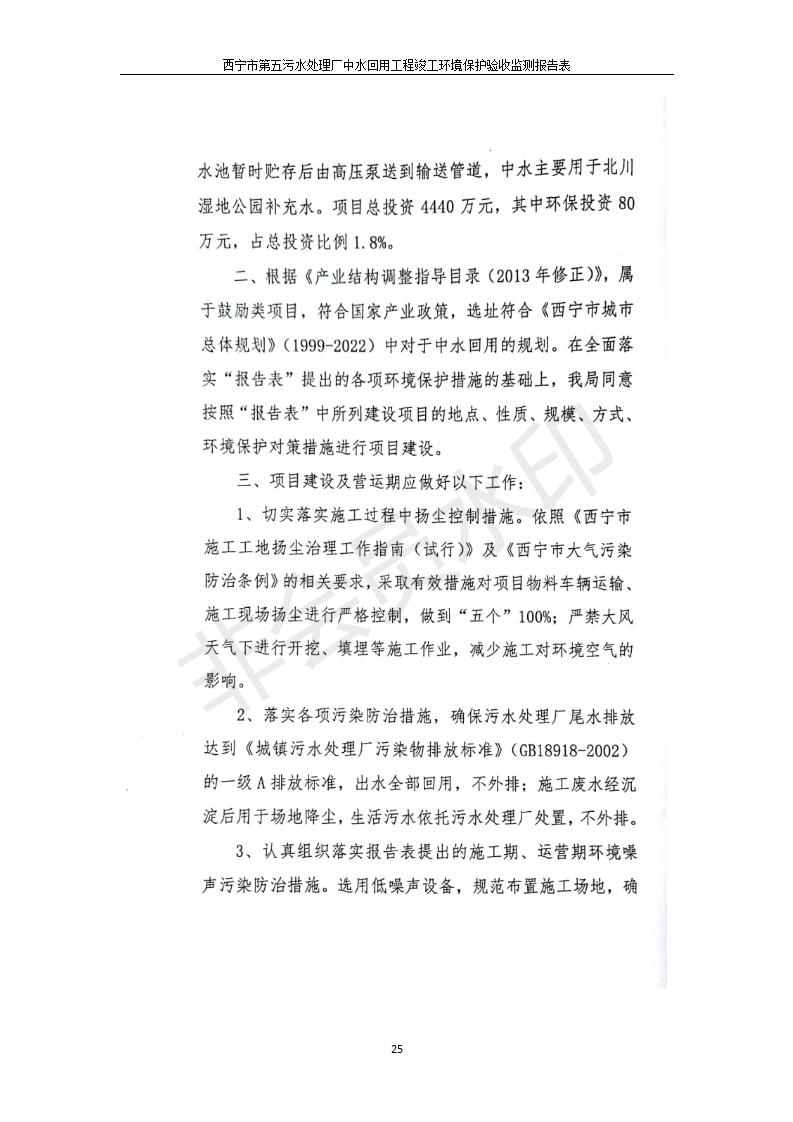 根據(jù)中華人民共和國國務院令第682號《國務院關(guān)于修改〈建設(shè)項目環(huán)境保護管理條例〉的決定》和《建設(shè)項目竣工環(huán)境保護驗收暫行辦法》(國務院令682號),西寧市第五污水處理廠中水回用工程建設(shè)項目(包括竣工環(huán)境保護驗收監(jiān)測報告表和驗收意見)公示如下。 一、項目名稱:西寧市第五污水處理廠中水回用工程建設(shè)項目 二、地點:西寧市城北區(qū)廿十里鋪雙蘇堡 三、建設(shè)單位:西寧市排水開發(fā)建設(shè)有限公司