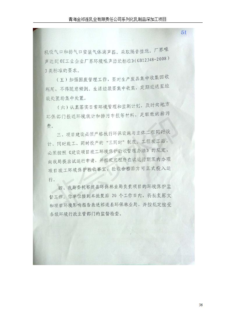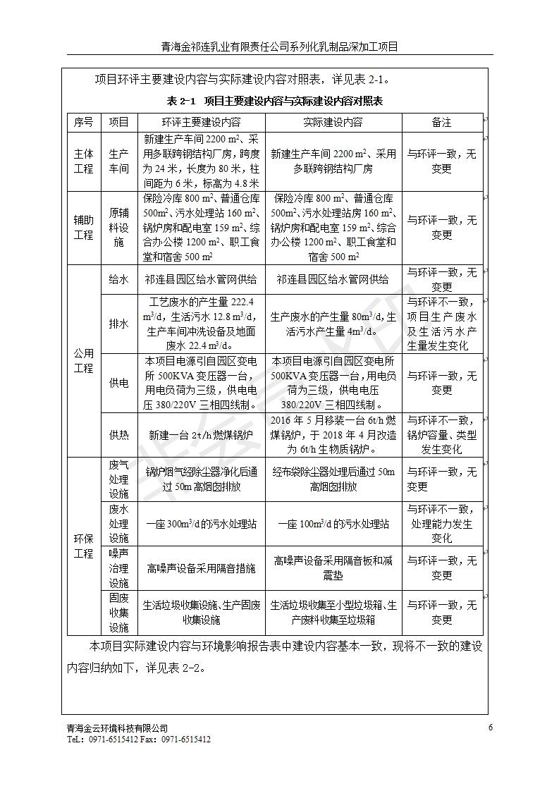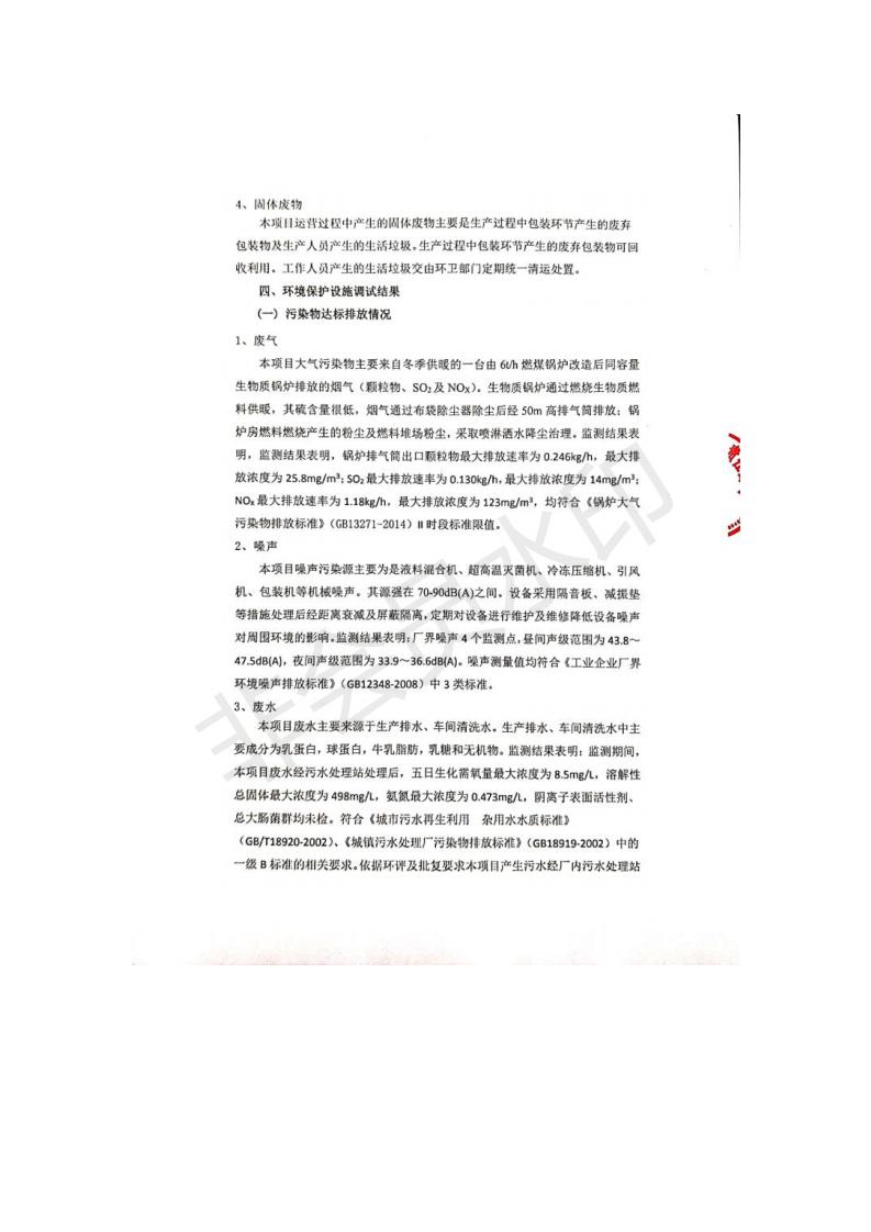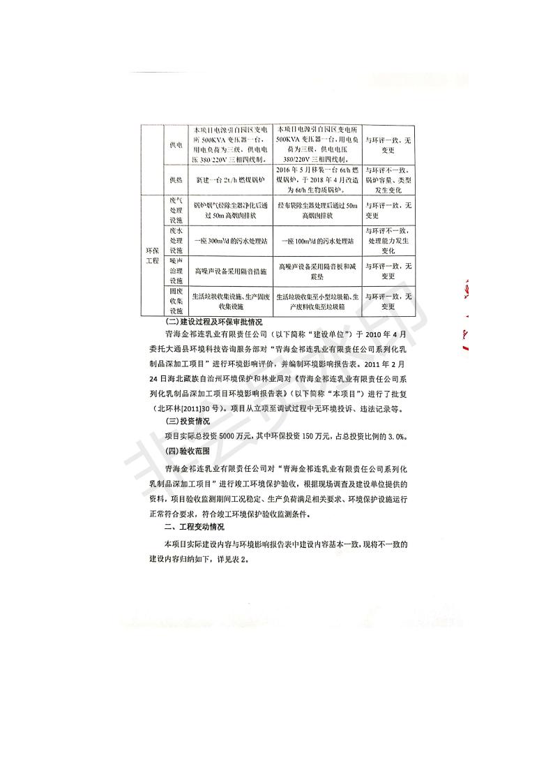 根據(jù)中華人民共和國(guó)國(guó)務(wù)院令第682號(hào)《國(guó)務(wù)院關(guān)于修改〈建設(shè)項(xiàng)目環(huán)境保護(hù)管理?xiàng)l例〉的決定》和《建設(shè)項(xiàng)目竣工環(huán)境保護(hù)驗(yàn)收暫行辦法》(國(guó)務(wù)院令682號(hào)),青海金祁連乳業(yè)有限責(zé)任公司系列化乳制品深加工項(xiàng)目(包括竣工環(huán)境保護(hù)驗(yàn)收監(jiān)測(cè)報(bào)告表和驗(yàn)收意見(jiàn))公示如下。 一、項(xiàng)目名稱:青海金祁連乳業(yè)有限責(zé)任公司系列化乳制品深加工項(xiàng)目 二、地點(diǎn):海北藏族自治州祁連縣冰溝農(nóng)牧產(chǎn)業(yè)化生態(tài)園區(qū) 三、建設(shè)單位:青海金祁連乳業(yè)有限責(zé)任公司 四、建設(shè)內(nèi)容:本項(xiàng)目新征工業(yè)用地40畝,新建生產(chǎn)車間2200 m2、采用多聯(lián)跨鋼結(jié)構(gòu)廠房,跨度為24米,長(zhǎng)度為80米,柱間距為6米,標(biāo)高為4.8米。廠房?jī)?nèi)部根據(jù)產(chǎn)品生產(chǎn)工藝及工序要求分為不同的工作區(qū)域和車間辦公室。建設(shè)有保鮮冷庫(kù)800 m2、普通倉(cāng)庫(kù)500m2、污水處理站房160 m2、鍋爐房和配電室159 m2、綜合辦公樓1200 m2、職工食堂和宿舍500 m2、其他輔助用房35 m2、蓄水池100 m2以及與土建工程相關(guān)聯(lián)的水、電、熱官網(wǎng)等輔助設(shè)施。 五、聯(lián)系人:張工 六、聯(lián)系電 話:0971-6515411 七、公示時(shí)間:二〇一九年七月十日至二〇一九年八月六日 公示期間,對(duì)上述公示內(nèi)容如有異議,請(qǐng)以書面形式反饋,個(gè)人須署真實(shí)姓名,單位須加蓋公章。