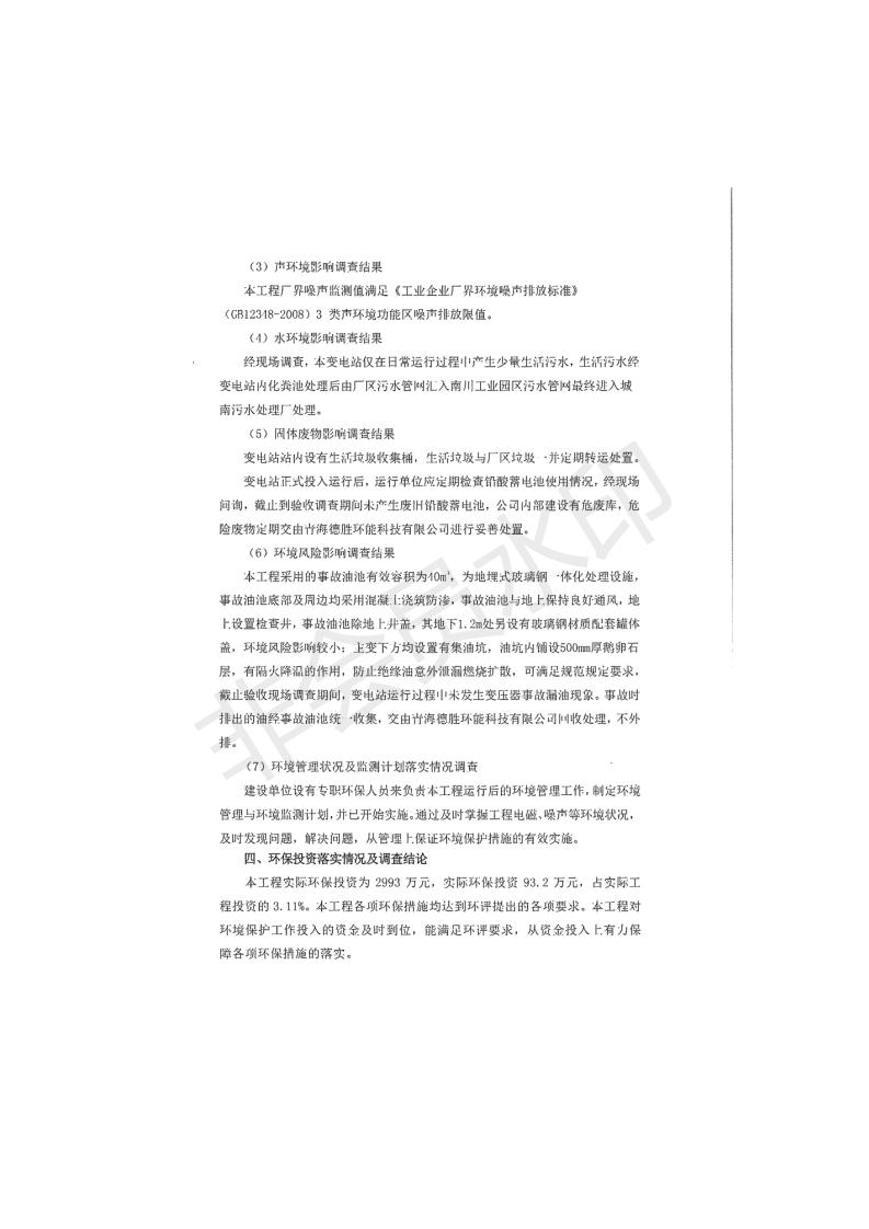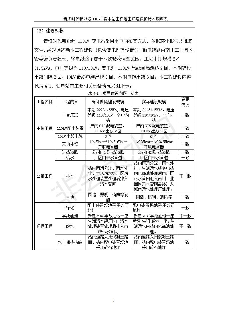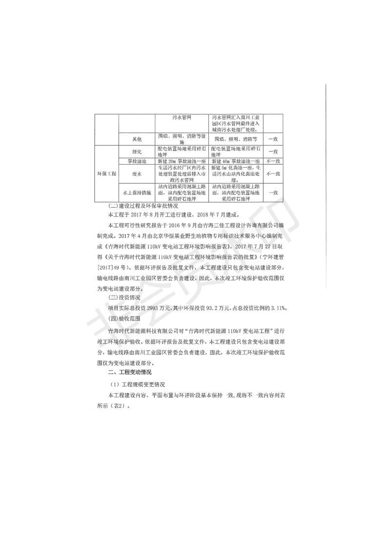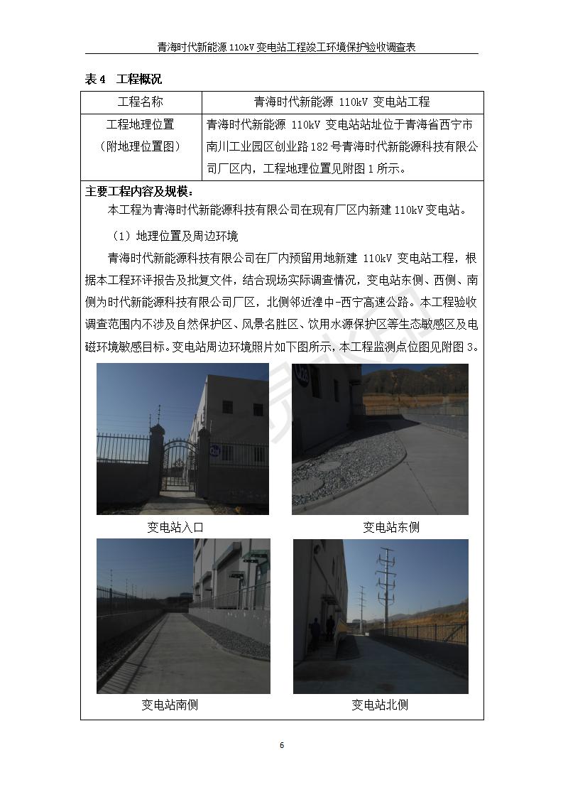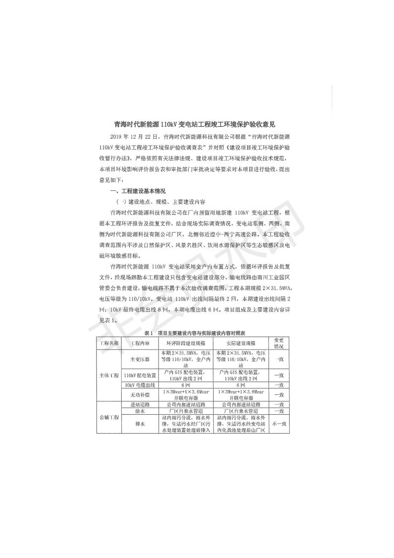 根據(jù)中華人民共和國(guó)國(guó)務(wù)院令第682號(hào)《國(guó)務(wù)院關(guān)于修改〈建設(shè)項(xiàng)目環(huán)境保護(hù)管理?xiàng)l例〉的決定》和《建設(shè)項(xiàng)目竣工環(huán)境保護(hù)驗(yàn)收暫行辦法》(國(guó)務(wù)院令682號(hào)),青海時(shí)代新能源110kV變電站工程(包括竣工環(huán)境保護(hù)驗(yàn)收調(diào)查表和驗(yàn)收意見(jiàn))公示如下。 一、項(xiàng)目名稱:青海時(shí)代新能源110kV變電站工程 二、地點(diǎn):青海省西寧市南川工業(yè)園區(qū)創(chuàng)業(yè)路182號(hào)青海時(shí)代新能源科技有限公司廠區(qū)內(nèi) 三、建設(shè)單位:青海時(shí)代新能源科技有限公司 四、建設(shè)內(nèi)容:青海時(shí)代新能源 110kV 變電站采用全戶內(nèi)布置方式,依據(jù)環(huán)評(píng)報(bào)告及批復(fù)文件,經(jīng)現(xiàn)場(chǎng)踏勘本工程建設(shè)只包含變電站建設(shè)部分,輸電線路由南川工業(yè)園區(qū)管委會(huì)負(fù)責(zé)建設(shè),輸電線路不屬于本次驗(yàn)收調(diào)查范圍。工程本期規(guī)模2×31.5MVA,電壓等級(jí)為110/10kV。變電站 110kV 出線間隔最終2回,本期建設(shè)出線間隔2回;10kV最終電纜出線8回,本期電纜出線6回。 五、聯(lián)系人:張工 六、聯(lián)系電話:0971-6515411 七、公示時(shí)間:二〇二〇年一月十四日至二〇二〇年二月十三日 公示期間,對(duì)上述公示內(nèi)容如有異議,請(qǐng)以書面形式反饋,個(gè)人須署真實(shí)姓名,單位須加蓋公章。