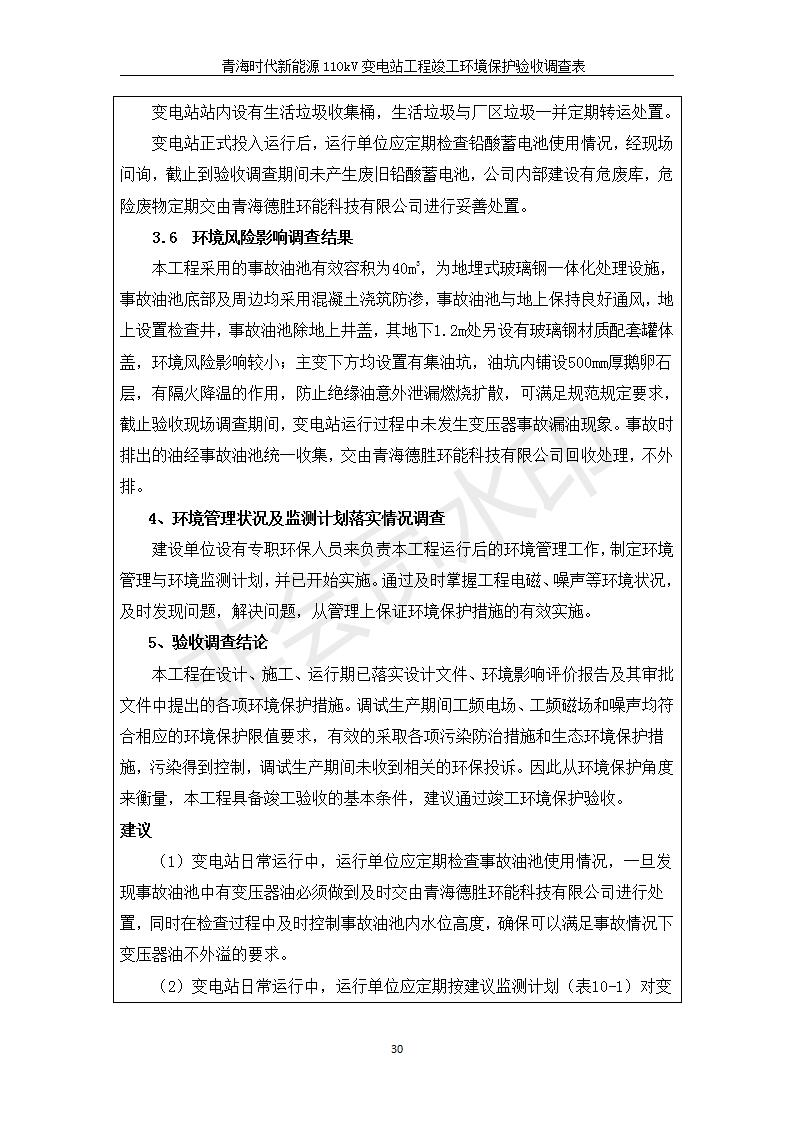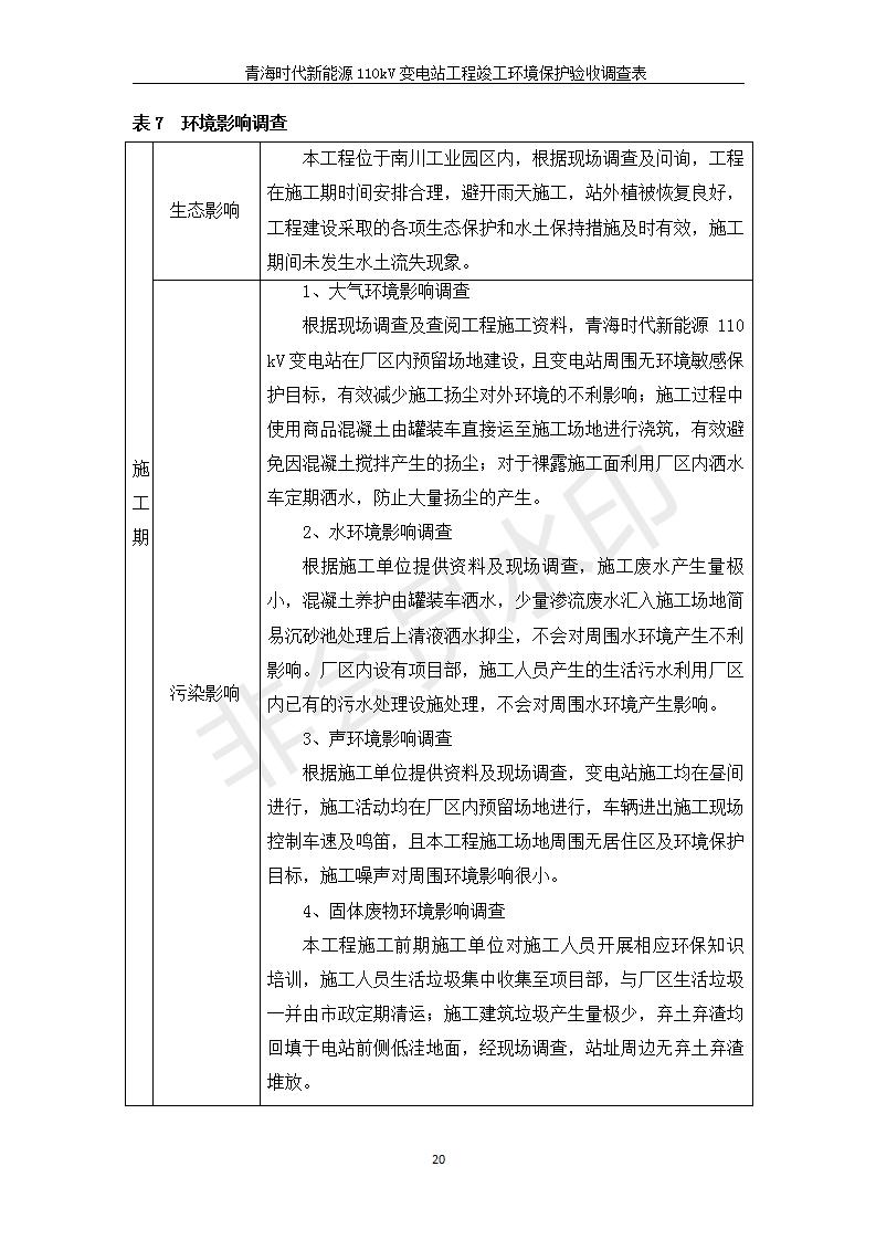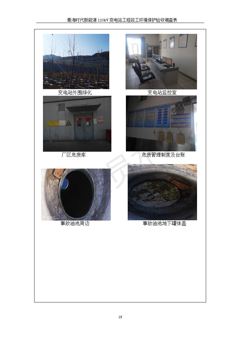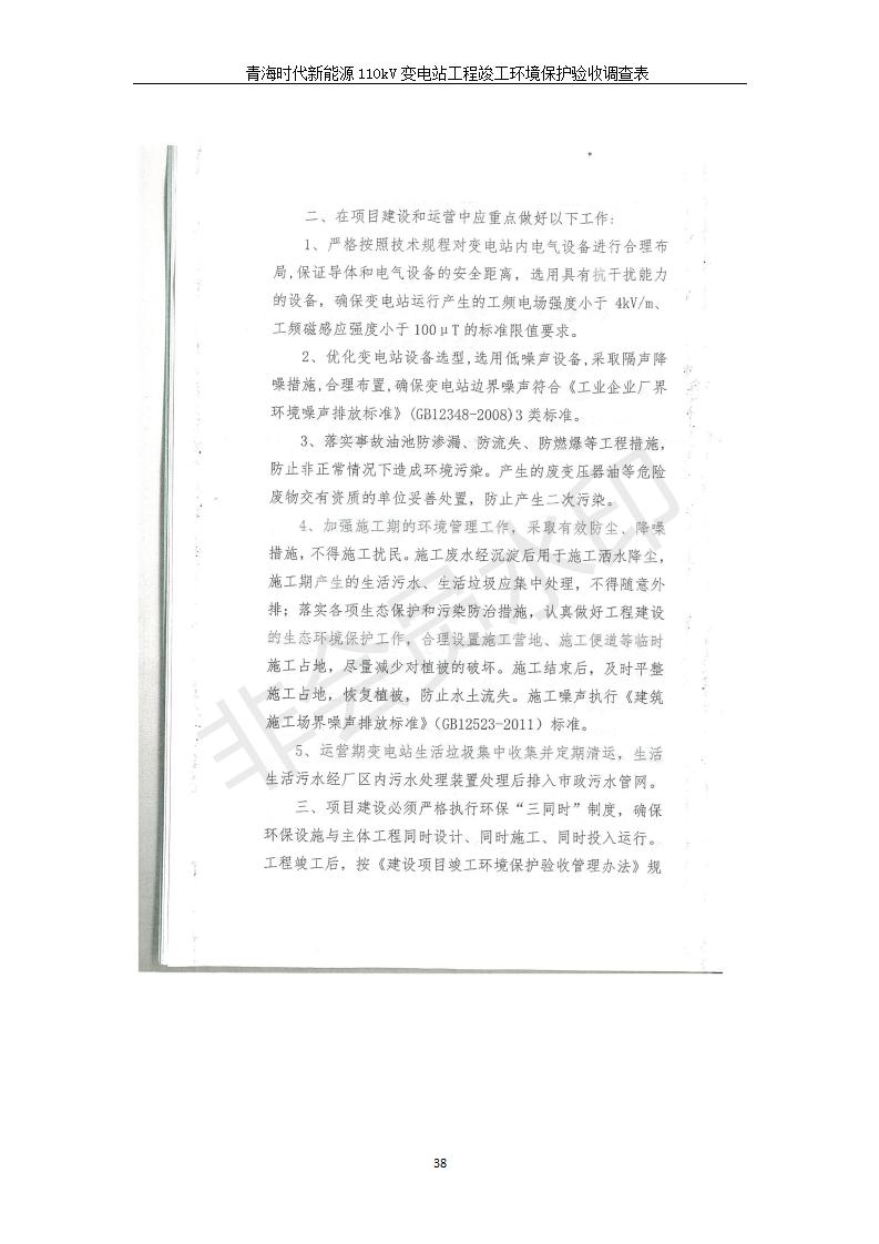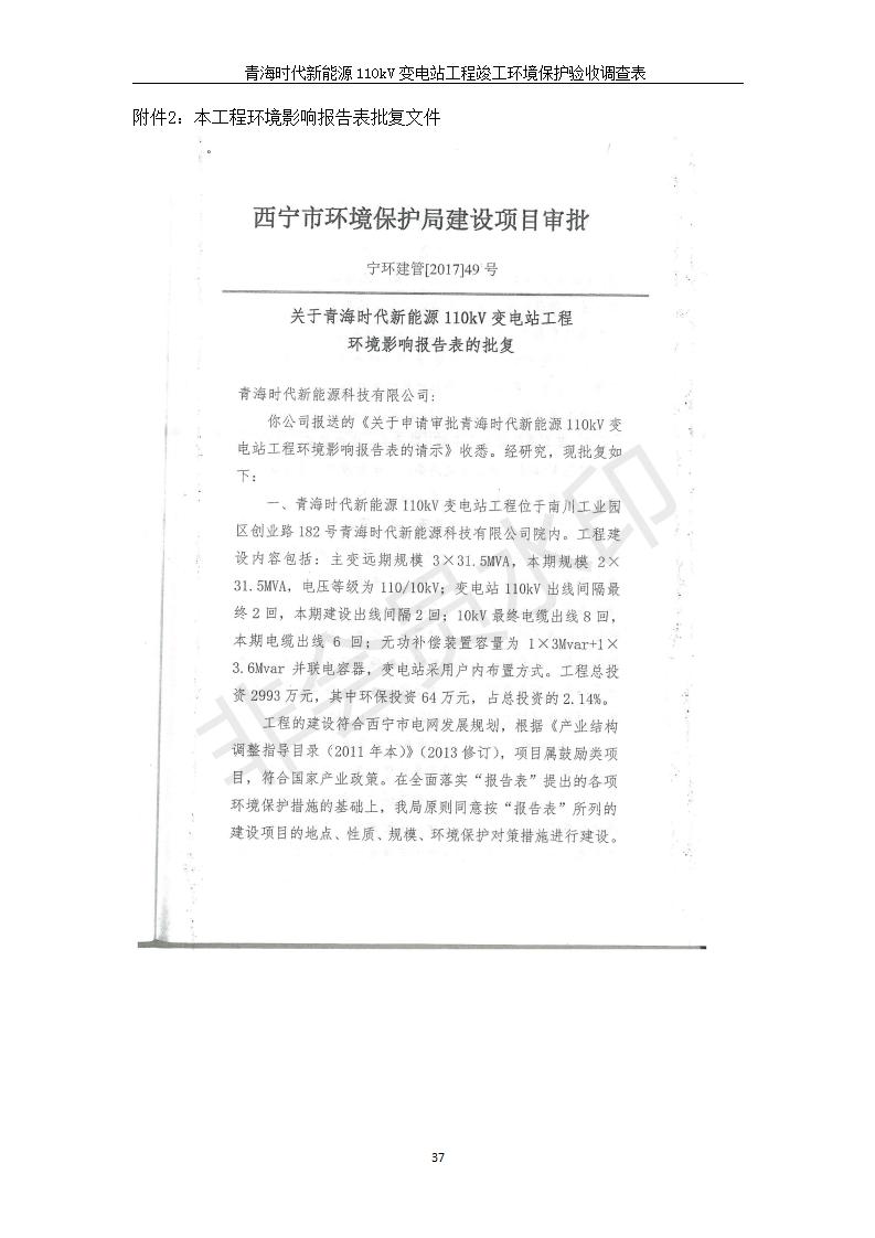 根據(jù)中華人民共和國(guó)國(guó)務(wù)院令第682號(hào)《國(guó)務(wù)院關(guān)于修改〈建設(shè)項(xiàng)目環(huán)境保護(hù)管理?xiàng)l例〉的決定》和《建設(shè)項(xiàng)目竣工環(huán)境保護(hù)驗(yàn)收暫行辦法》(國(guó)務(wù)院令682號(hào)),青海時(shí)代新能源110kV變電站工程(包括竣工環(huán)境保護(hù)驗(yàn)收調(diào)查表和驗(yàn)收意見(jiàn))公示如下。 一、項(xiàng)目名稱:青海時(shí)代新能源110kV變電站工程 二、地點(diǎn):青海省西寧市南川工業(yè)園區(qū)創(chuàng)業(yè)路182號(hào)青海時(shí)代新能源科技有限公司廠區(qū)內(nèi) 三、建設(shè)單位:青海時(shí)代新能源科技有限公司 四、建設(shè)內(nèi)容:青海時(shí)代新能源 110kV 變電站采用全戶內(nèi)布置方式,依據(jù)環(huán)評(píng)報(bào)告及批復(fù)文件,經(jīng)現(xiàn)場(chǎng)踏勘本工程建設(shè)只包含變電站建設(shè)部分,輸電線路由南川工業(yè)園區(qū)管委會(huì)負(fù)責(zé)建設(shè),輸電線路不屬于本次驗(yàn)收調(diào)查范圍。工程本期規(guī)模2×31.5MVA,電壓等級(jí)為110/10kV。變電站 110kV 出線間隔最終2回,本期建設(shè)出線間隔2回;10kV最終電纜出線8回,本期電纜出線6回。 五、聯(lián)系人:張工 六、聯(lián)系電話:0971-6515411 七、公示時(shí)間:二〇二〇年一月十四日至二〇二〇年二月十三日 公示期間,對(duì)上述公示內(nèi)容如有異議,請(qǐng)以書面形式反饋,個(gè)人須署真實(shí)姓名,單位須加蓋公章。