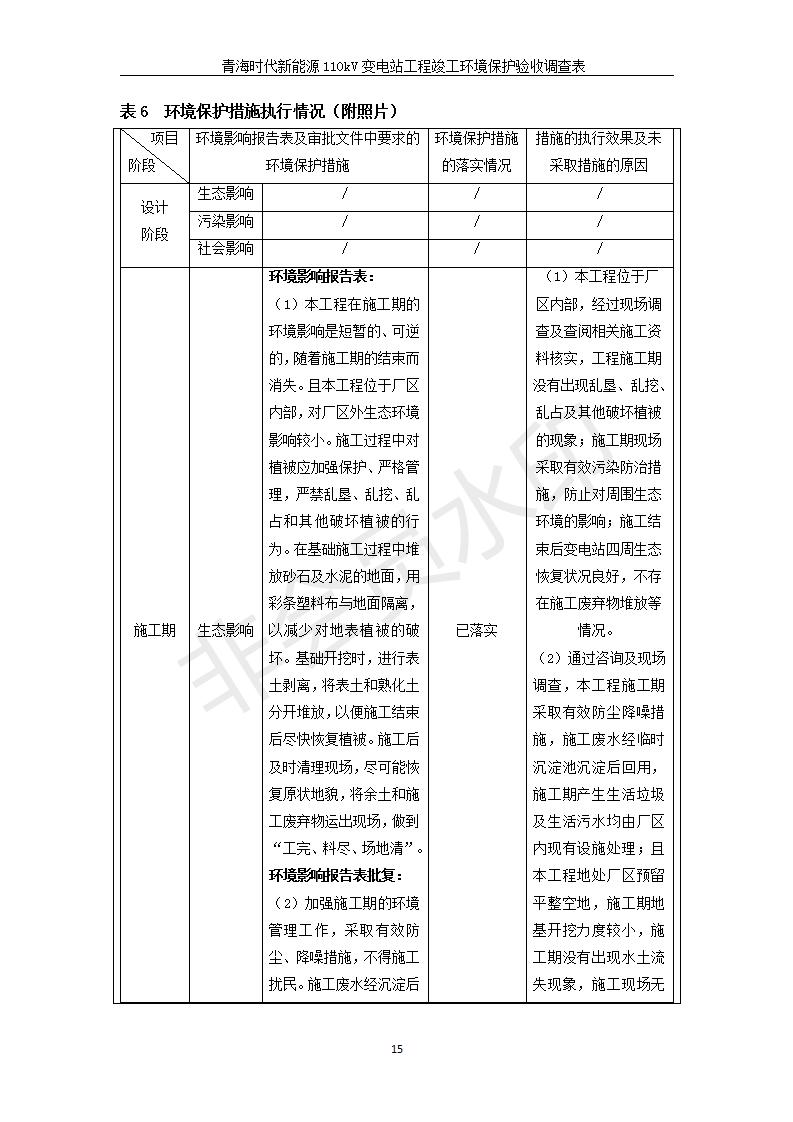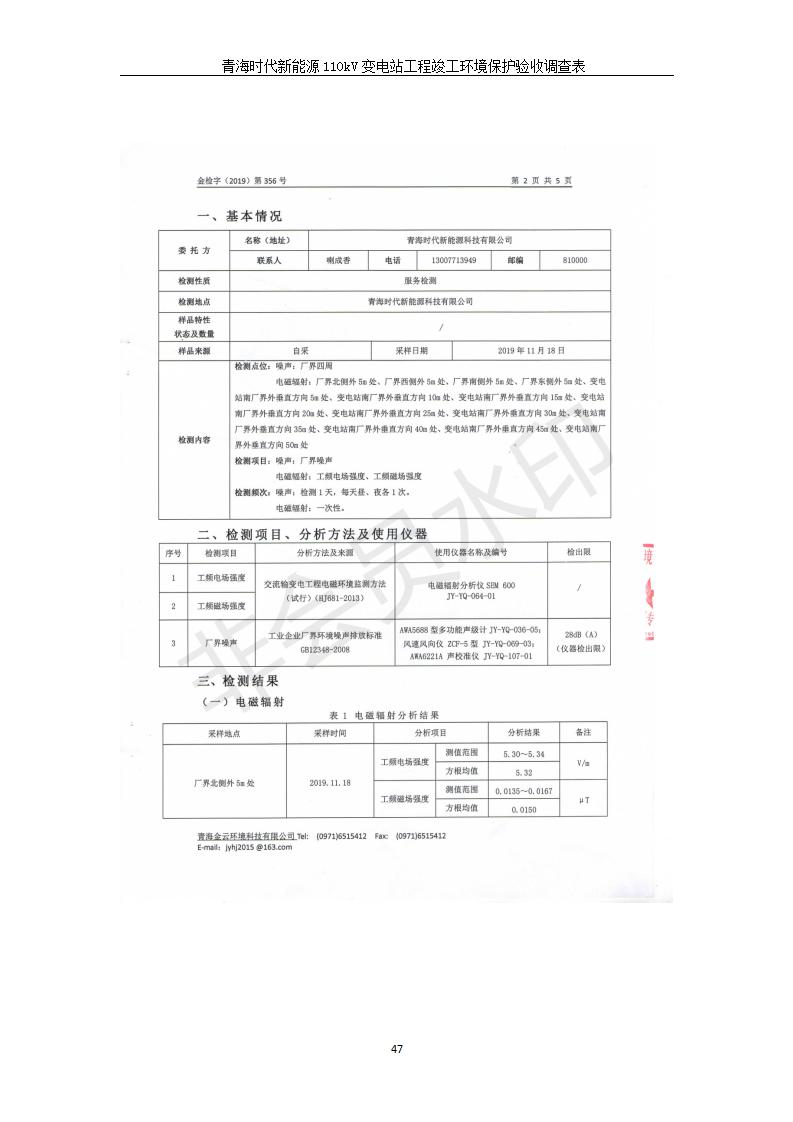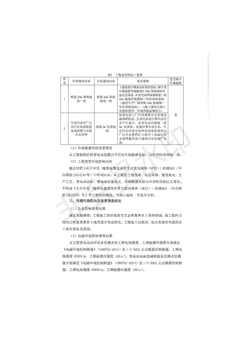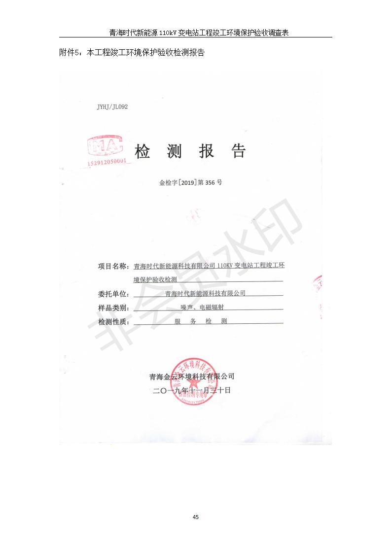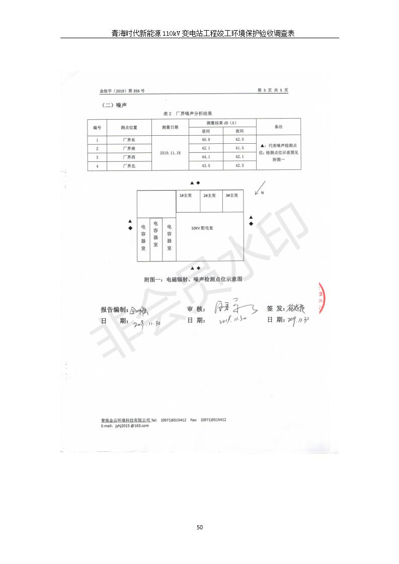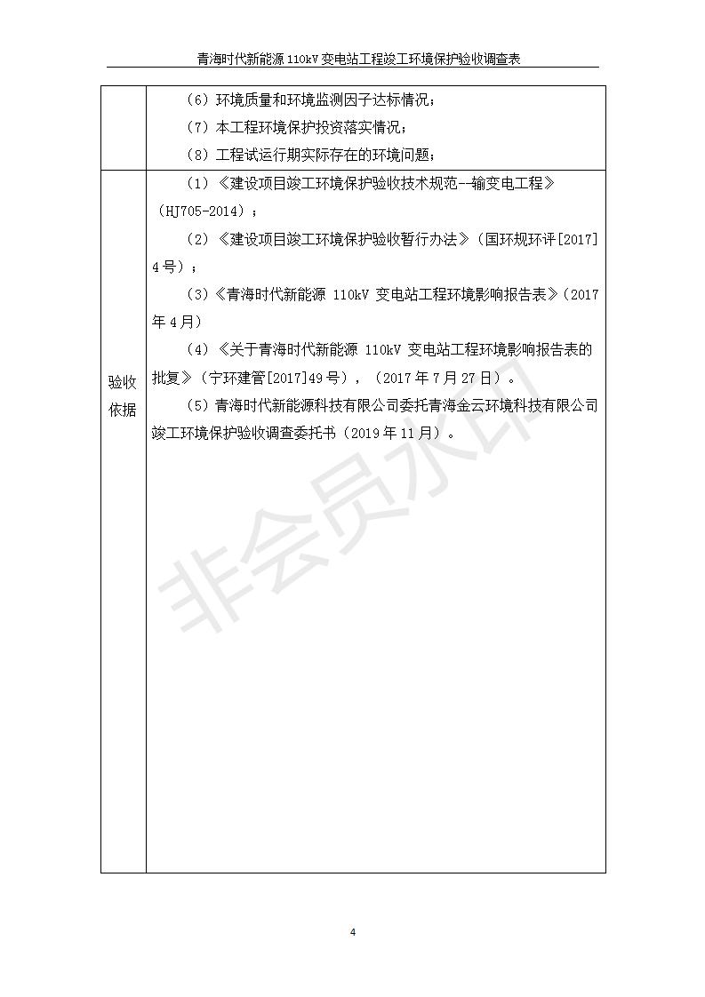 根據(jù)中華人民共和國(guó)國(guó)務(wù)院令第682號(hào)《國(guó)務(wù)院關(guān)于修改〈建設(shè)項(xiàng)目環(huán)境保護(hù)管理?xiàng)l例〉的決定》和《建設(shè)項(xiàng)目竣工環(huán)境保護(hù)驗(yàn)收暫行辦法》(國(guó)務(wù)院令682號(hào)),青海時(shí)代新能源110kV變電站工程(包括竣工環(huán)境保護(hù)驗(yàn)收調(diào)查表和驗(yàn)收意見(jiàn))公示如下。 一、項(xiàng)目名稱:青海時(shí)代新能源110kV變電站工程 二、地點(diǎn):青海省西寧市南川工業(yè)園區(qū)創(chuàng)業(yè)路182號(hào)青海時(shí)代新能源科技有限公司廠區(qū)內(nèi) 三、建設(shè)單位:青海時(shí)代新能源科技有限公司 四、建設(shè)內(nèi)容:青海時(shí)代新能源 110kV 變電站采用全戶內(nèi)布置方式,依據(jù)環(huán)評(píng)報(bào)告及批復(fù)文件,經(jīng)現(xiàn)場(chǎng)踏勘本工程建設(shè)只包含變電站建設(shè)部分,輸電線路由南川工業(yè)園區(qū)管委會(huì)負(fù)責(zé)建設(shè),輸電線路不屬于本次驗(yàn)收調(diào)查范圍。工程本期規(guī)模2×31.5MVA,電壓等級(jí)為110/10kV。變電站 110kV 出線間隔最終2回,本期建設(shè)出線間隔2回;10kV最終電纜出線8回,本期電纜出線6回。 五、聯(lián)系人:張工 六、聯(lián)系電話:0971-6515411 七、公示時(shí)間:二〇二〇年一月十四日至二〇二〇年二月十三日 公示期間,對(duì)上述公示內(nèi)容如有異議,請(qǐng)以書面形式反饋,個(gè)人須署真實(shí)姓名,單位須加蓋公章。