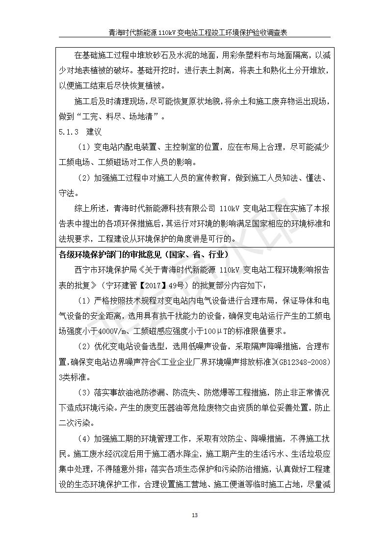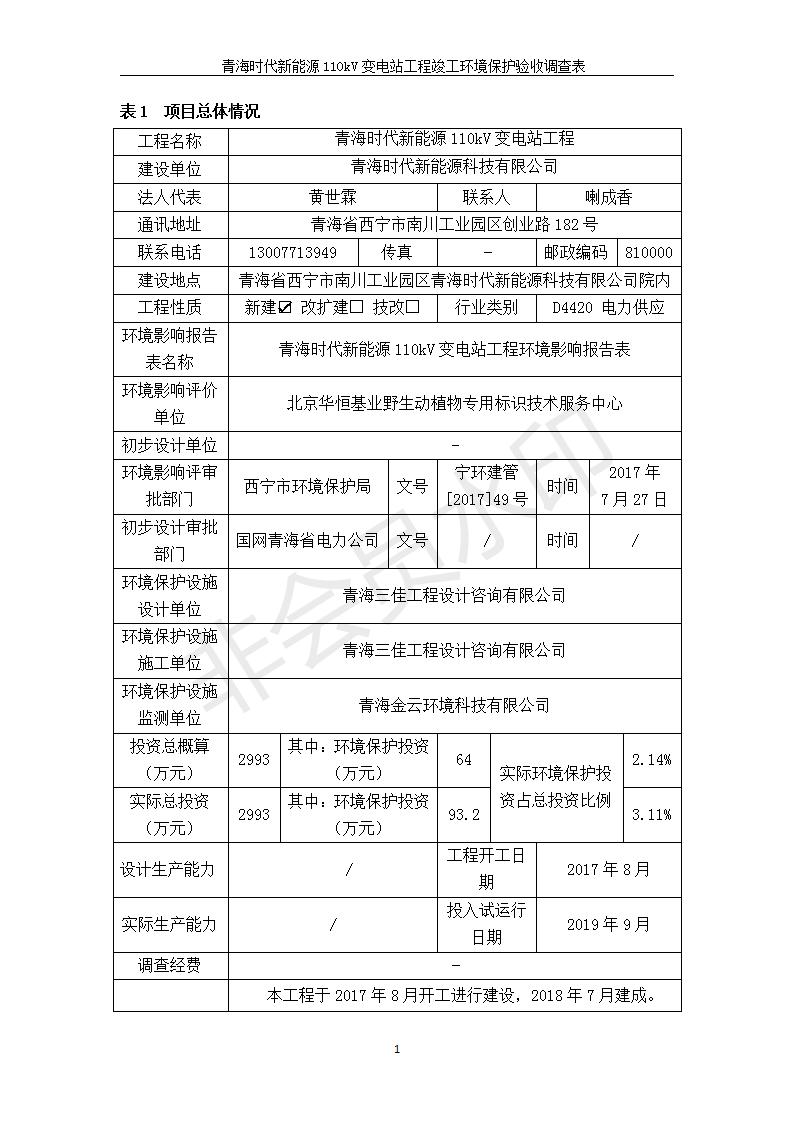 青海時(shí)代新能源110kV變電站工程竣工環(huán)境保護(hù)驗(yàn)收調(diào)查表公示發(fā)布日期:(2020-1-14) 點(diǎn)擊次數(shù):2589 |