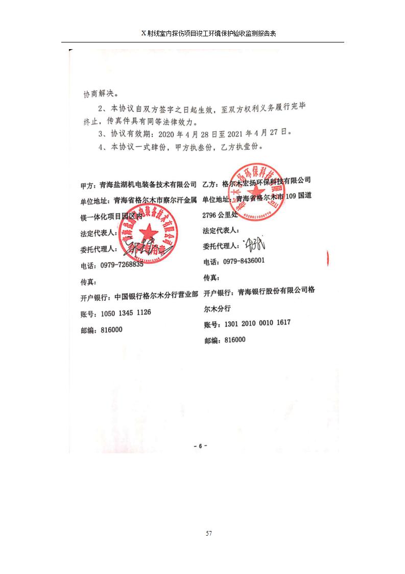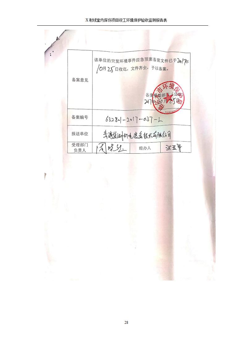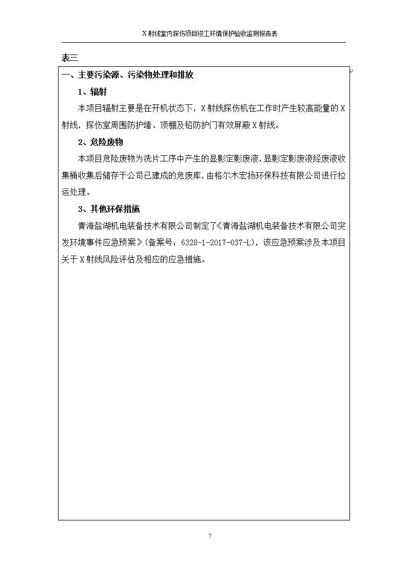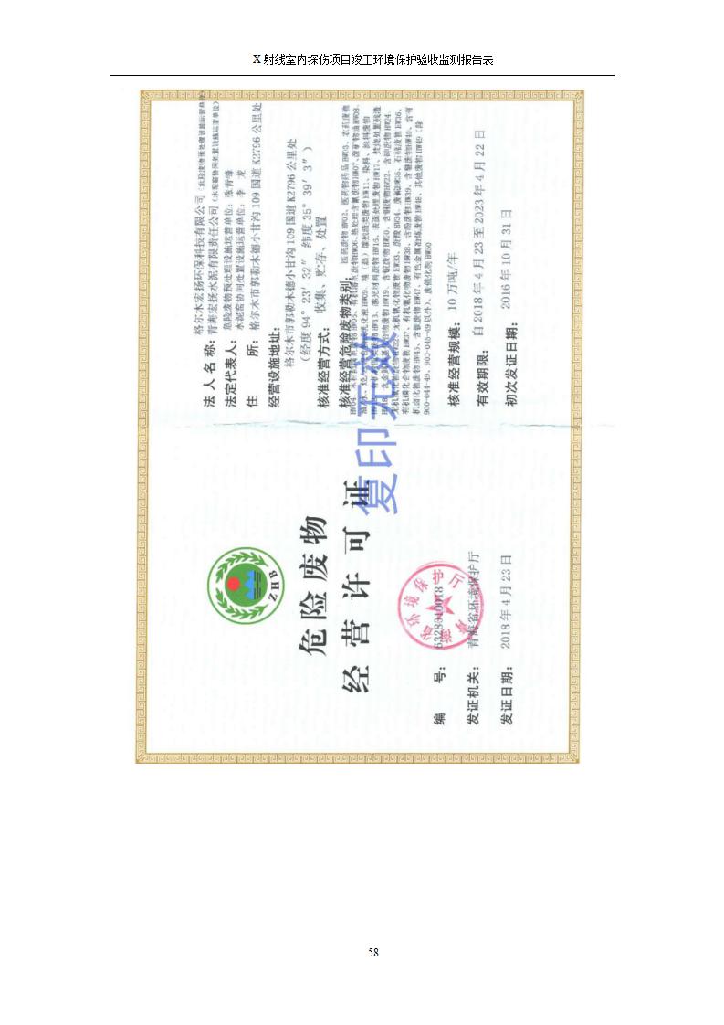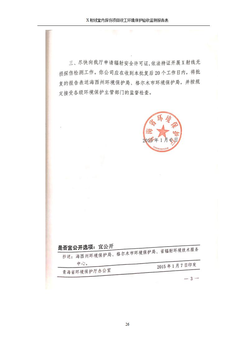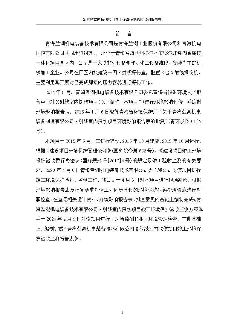 根據(jù)中華人民共和國國務(wù)院令第682號《國務(wù)院關(guān)于修改〈建設(shè)項目環(huán)境保護管理條例〉的決定》和《建設(shè)項目竣工環(huán)境保護驗收暫行辦法》(國務(wù)院令682號),青海鹽湖機電裝備技術(shù)有限公司X射線室內(nèi)探傷項目竣工環(huán)境保護驗收監(jiān)測報告表公示如下。 一、項目名稱:X射線室內(nèi)探傷項目竣工環(huán)境保護驗收監(jiān)測報告表 二、地點:青海省海西州格爾木市察爾汗鹽湖金屬鎂一體化項目園區(qū)內(nèi) 三、建設(shè)單位:青海鹽湖機電裝備技術(shù)有限公司 四、建設(shè)內(nèi)容:本項目位于公司三號車間廠房內(nèi),探傷室長21m,寬9.3m,共有3臺X射線探傷機。 五、聯(lián)系人:楊工 六、聯(lián)系電 話:0971-6515411 七、公示時間:二〇二〇年七月十日至二〇二〇年八月六日 公示期間,對上述公示內(nèi)容如有異議,請以書面形式反饋,個人須署真實姓名,單位須加蓋公章。